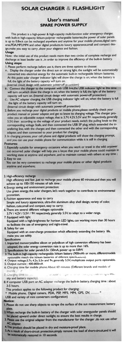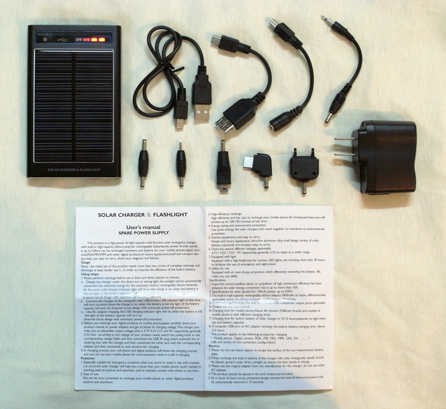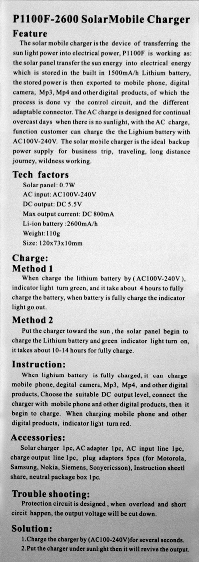 ชาร์จมือถือด้วยพลังงานแสงอาทิตย์ Solar Charger รายละเอียด technical อุปกรณ์ในกล่อง