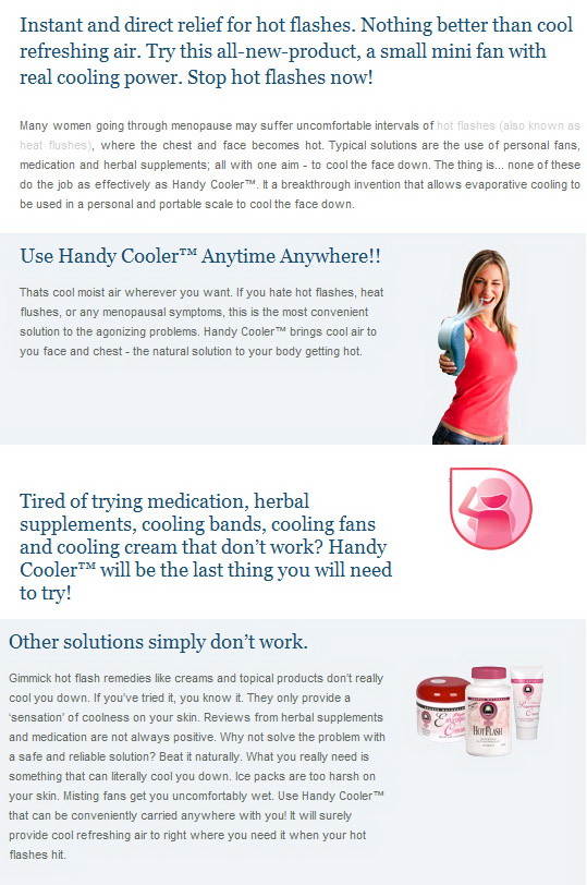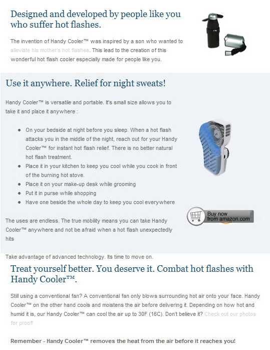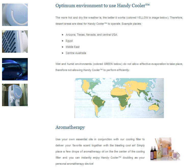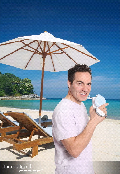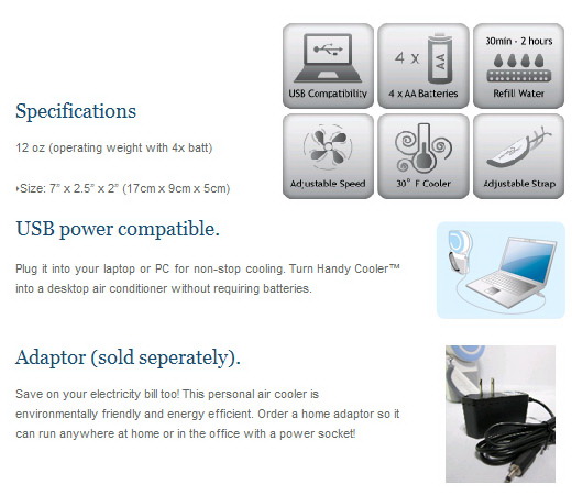 The Handy Cooler™ is not your normal small fan. The Handy Cooler™ is your own portable mini air conditioner that provides you with a continuous stream of cool air that's perfect whether you're at home or on the go. Handy Cooler's™ sleek, ergonomic design runs on batteries, USB, or a standard 110V outlet (sold separately) for true versatility. To activate your mini air conditioner, all you have to do is soak the cellulose cooling filter (included) with water and turn the Handy Cooler™ on -- you'll immediately get a comfortable and refreshing supply of evaporated air greatly superior to that of other small fans. The humidifying effect of the Handy Cooler™ mini air conditioner also helps with breathing problems and provides essential moisture to the skin.