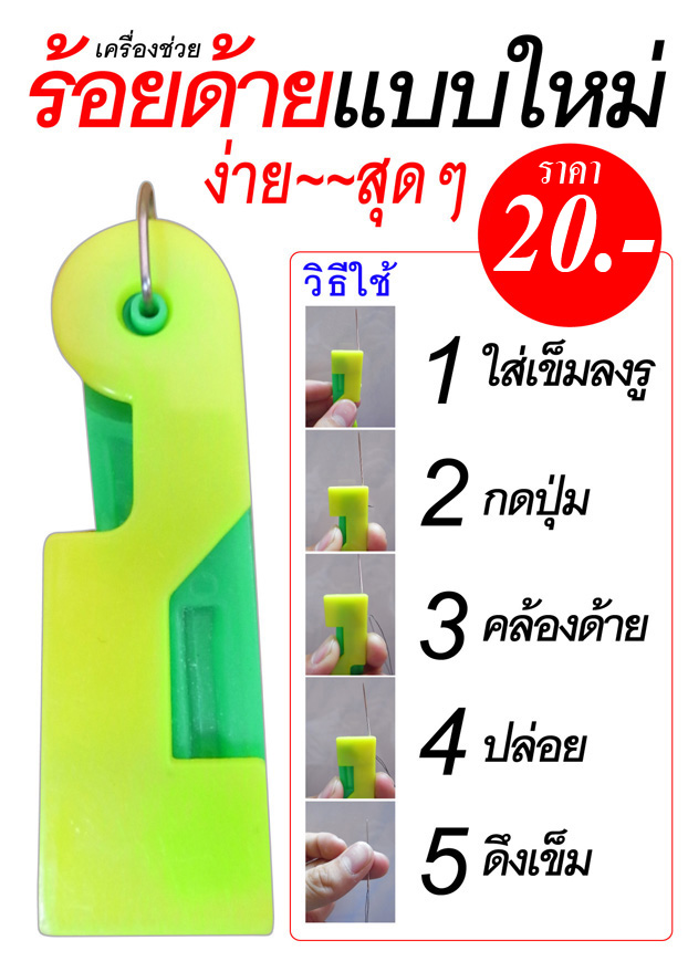 ได้ทุกเบอร์ ได้ทุกรูปแบบ เข็มพวงมาลัยก็ยังร้อยได้ 4. ราคาถูก สามารถซื้อได้ แม้ตัวเดียวก็ยังส่ง (1 ตัว 20.- + ค่าส่ง 10.- โอนเงินมา 30.- ส่งให้ทันที) 5. มีคู่มือให้ภาษาไทย คนที่ไม่เคยใช้มาก่อนก็สามารถทำได้อย่างง่ายดาย 6. เมื่อเอาไปแจกให้คนที่คุณรู้จัก เวลาเขาใช้หรือจับตัวช่วยร้อยเข็มนี้ขึ้นมา เขาจะนึกถึงคุณเสมอ 7. ไม่มีขายที่ต่างจังหวัดแน่นอน เพราะฉะนั้นใครได้ไป โชคดีที่สุดในโลก 8. 100% ของผู้ที่ได้เห็น จะชอบมากๆ โดยเฉพาะ ผู้ที่อายุตั้งแต่ 25 ปี ขึ้นไป 9. กรณีเสีย สามารถเปลี่ยนตัวใหม่ได้ทันที (เปลี่ยนได้ที่หน้าร้าน) 10. สามารถซ่อมได้ด้วยตัวเอง หากเสียแล้วไม่อยากไปเปลี่ยน โดยการใช้คีมดัดตะขออย่างง่ายๆ 11. ทำไม่ได้ ให้โทรถามเตี้ยงได้ 12. มีการซัพพอร์ทการใช้งานหลังการซื้อสมบูรณ์แบบ ดูวิธีใช้ จากด้านล่าง