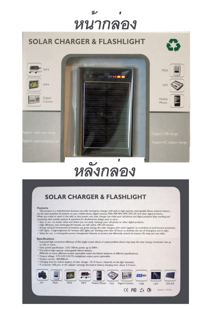 ชาร์จมือถือด้วยพลังงานแสงอาทิตย์ Solar Charger รายละเอียด technical อุปกรณ์ในกล่อง