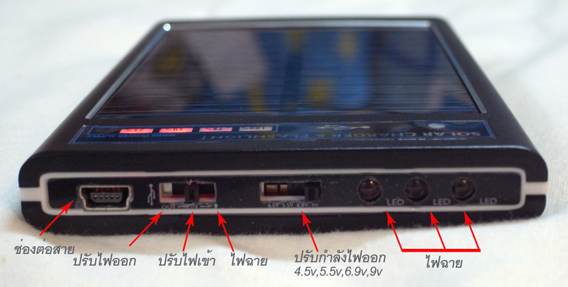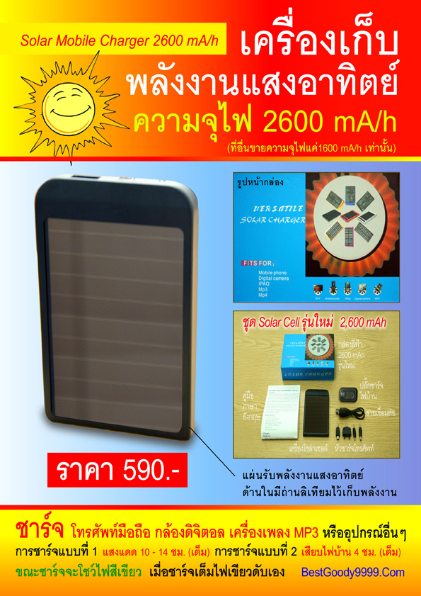 ขอแนะนำตัวเลือกอีกรุ่น ~ รุ่นใหญ่ Premium Solar Mobile Charger with Flashlight ราคา 1,290.- Pakage กล่องสุดหรู ตัวเครื่อง build in ไฟฉาย สามารถใช้เป็นไฟฉายฉุกเฉินได้ ชาร์จโทรศัพท์ได้ ความสามารถที่เหนือกว่ารุ่นเล็กคือ สามารถปรับระดับ ไฟ output ได้ 3.7V , 4.5V , 5.5V , 9V โทรศัพท์ทั่วไปจะใช้ไฟ 5.5V ถ้าเครื่องรุ่นใหม่ขึ้นจะใช้ไฟที่แรงกว่า ดูว่าเครื่องคุณใช้ไฟเท่าไหร่ ลองดูที่ แบตเตอรี่ด้านหลัง จะเขียนไว้ชัดเจน เช่น 3.4v 700mAh หรือ 5.5v 650mAh ไฟ v ที่มากกว่า สามารถชาร์จไฟที่อ่อนกว่าเล็กน้อยได้ +-ไม่เกิน 2 ถ้าไฟชาร์จ 3.4 ชาร์จด้วย 5.5 จะชาร์จได้เร็วกว่าปกติเล็กน้อย ควรปรับไฟ vให้ตรงกับอุปกรณ์ก่อนใช้จะดีที่สุด ไฟออก 9v เป็นไฟของเครื่อง net book (จึงสามารถชาร์จได้ ถ้ามีหัวต่อ) แต่กำลังไฟ 2600mAh ในกำลังไฟ 9v จะชาร์จได้ไม่นานมาก สำหรับ net book ถ้าต้องการชาร์จ Note Book เราขอแนะนำ เครื่องชาร์จ Note Book พกพาโดยเฉพาะ ซึ่งกำลังไฟสูงมากถึง 20,000 mAh และ 80,000 mAh ทีเดียว เก็บพลังงานได้มากกว่าเยอะ ตัวเครื่องชาร์จของเราขาย 1,290 บาท ที่อื่นขายเกือบ 3,000 เลยทีเดียวในรุ่นเดียวกัน