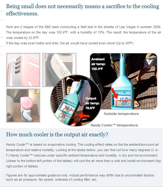 จากการทดสอบในต่างประเทศที่มีสภาวะอากาศค่อนข้างแห้ง ความชื้นต่ำ จะลดอุณหภูมิได้ถึง 25 องศาเซลเซียส แต่หากนำมาใช้ในประเทศไทย อาจจะทำได้อย่างเก่งแค่ 27-28 องศาเซลเซียส เท่านั้น เนื่องจากบ้านเราเ็ป็้นเมืองร้อนชื้น ด้วยความชื้นสัมพัทธ์ในอากาศค่อนข้างสูงเกือบตลอดทั้งปี ซึ่งมีผลอย่างยิ่งต่ออัตราการระเหยน้ำ เพื่อลดอุณหภูมิของอากาศ