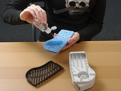 วิธีการใช้งาน ก่อนใช้งาน ก็เติมน้ำลงบนสื่อที่มีลักษณะอุ้มน้ำ(คล้ายๆฟองน้ำ) ซึ่งทำหน้าที่เป็นตัวกลางในการแลกเปลี่ยนความร้อนในกระบวนการระเหยน้ำเพื่อผลิตอากาศเย็น หลังจากประกอบเข้าด้วยกัน ก็พกติดตัวออกจากบ้านได้เลย