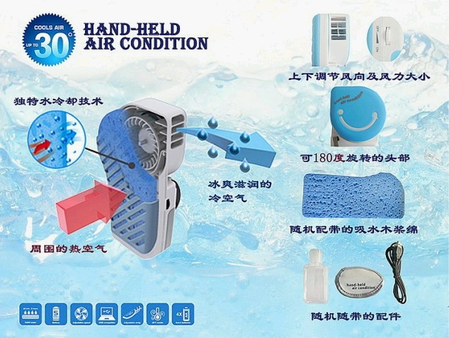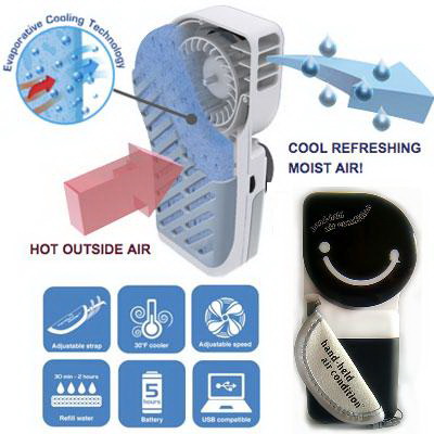 ก่อนอากาศร้อนๆ ออกไปข้างนอกก็พกพัดไปพัดด้วย ต่อมาเดี๋ยวนี้ก็เป็น พัดลมมือถืออันเล็กๆ อย่างเวลาไปเดินเล่นที่ไหนก็หยิบขึ้นมาเปิดหมุนๆ ให้ ความเย็น บรรเทาอากาศร้อนกันไปได้บ้าง แต่ตอนนี้พัดลมมือถือคงจะเย็นไม่พออีกแล้ว ก็โลกมันร้อนขึ้นทุกวันๆ เรา จึงได้เห็นเจ้าแอร์มือถือบ้าง ซึ่งเป็นเครื่องทำความเย็นขนาดเล็ก พกพา ซึ่งสามารถใช้ได้แบบพกพาหรือจะตั้งไว้บนโต๊ะทำงานก็ได้ เพราะใช้ได้ ทั้งแบตเตอรี่แบบ AA 4 ก้อน และ แบบต่อกับพอร์ต USB ได้ เจ้าแอร์นี้ทำความเย็นด้วยไอน้ำจากด้านใน ที่สามารถเติมได้ง่ายๆ และ สามารถทำความเย็นได้ถึง 25 องศาเซลเซียสเลย