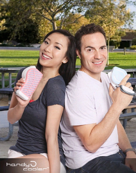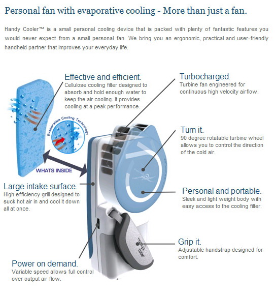 The Handy Cooler™ is not your normal small fan. The Handy Cooler™ is your own portable mini air conditioner that provides you with a continuous stream of cool air that's perfect whether you're at home or on the go. Handy Cooler's™ sleek, ergonomic design runs on batteries, USB, or a standard 110V outlet (sold separately) for true versatility. To activate your mini air conditioner, all you have to do is soak the cellulose cooling filter (included) with water and turn the Handy Cooler™ on -- you'll immediately get a comfortable and refreshing supply of evaporated air greatly superior to that of other small fans. The humidifying effect of the Handy Cooler™ mini air conditioner also helps with breathing problems and provides essential moisture to the skin.