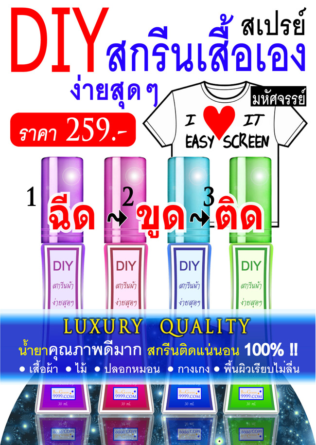 สเปรย์น้ำยามหัศจรรย์ ที่จะช่วยให้คุณสกรีนผ้า หรือพื้นผิวต่างๆ ด้วยตัวคุณเองได้ง่ายๆ โดยไม่ต้องมีอุปกรณ์เพิ่มเติมใดๆทั้ง ทำเองได้ทันที ง่ายสุดๆ น้ำยาคุณภาพดีมาก สกรีนติดแน่นอน 100% !!