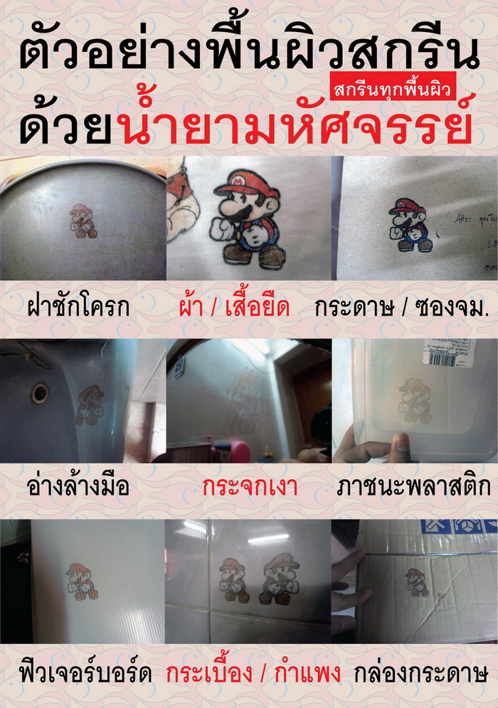 วิธีการทำ 1. เตรียม รูป ที่เราต้องการสกรีน ด้วยการ นำไปถ่ายเอกสารขาว-ดำ หรือ สี หรือ พิมพ์ด้วยเครื่องพิมพ์เลเซอร์ ไม่สามารถใช้เครื่อง inkjet ได้ หรือใช้ภาพจากนิตยสารญี่ปุ่นเท่านั้น (ของไทยใช้ไม่ได้) กระดาษขาวที่ใช้ควรมีความหนา 80แกรม แนะนำให้ใช้กระดาษดับเบิ้ล A เพราะเหนียว ขาดยาก 2. ภาพที่ต้องการสกรีนลงจะกลับด้านกัน เพราะฉนั้นก่อนสั่งพิมพ์เลเซอร์ต้องกลับด้านก่อน (เหมือนการส่องกระจก) 3.รูปที่นำมาสกรีนต้องเหลือพื้นที่กระดาษพอให้จับด้วยนะครับ ยิ่งเยอะยิ่งดีจะได้จับสะดวก 4.นำรูปที่จะสกรีนมาวางไว้ที่ผ้าโดยเอารูปลง อาจจะติดสก๊อตเทปกันภาพเลื่อน 5.ฉีดสเปรย์มหัศจรรย์ลงกระดาษ เราจะเห็นลายชัดเจน 6.ใช้เหรียญ 10 บาทขูดตามแนวไปทางเดียวกัน (พยายามขูดทันทีหลังฉีดน้ำยาลงกระดาษกันน้ำยาแห้งก่อน) ด้วยแรงปานกลาง(ไม่แรงจนกระดาษขาด) 7.ภาพที่ขูดแล้วจะใช้สกรีนได้ครั้งเดียว 8.เมื่อขูดเสร็จ เอากระดาษออก จะได้ภาพที่ติดเสื้อสมบูรณ์ 9.รอน้ำยาแห้งประมาณ 2 นาที * เมื่อสกรีนแล้ว ภาพจะลบไม่ออก ซักไม่ออก ใช้ได้กับผ้าขาว สีทุกสี ยกเว้นสีดำ กระเบื้องดินเผา ไม้ และอื่นๆ เกือบทุกพื้นผิว มหัศจรรย์มากๆ